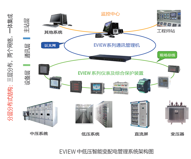EVIEW中低壓智能變配電管理系統(tǒng)基于“三層分布,兩個(gè)網(wǎng)絡(luò),一體集成”的架構(gòu)。即由設(shè)備層、通訊層及主站層三個(gè)不同層次中的設(shè)備,通過(guò)現(xiàn)場(chǎng)總線及以太網(wǎng)兩個(gè)網(wǎng)絡(luò)連接形成一個(gè)有機(jī)整體。